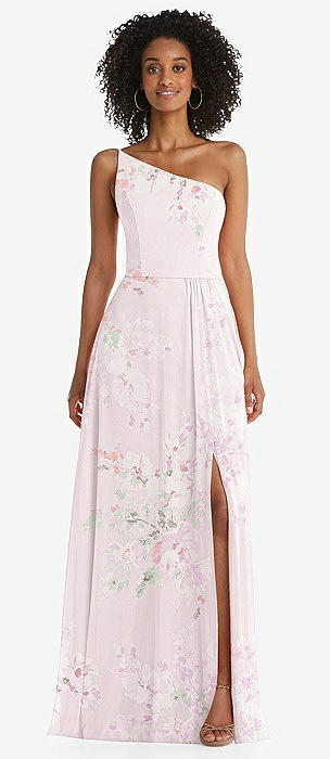 One-Shoulder Chiffon Maxi Dress with Shirred Front Slit in watercolor print