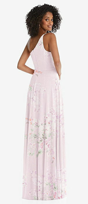 One-Shoulder Chiffon Maxi Dress with Shirred Front Slit in coquette floral print