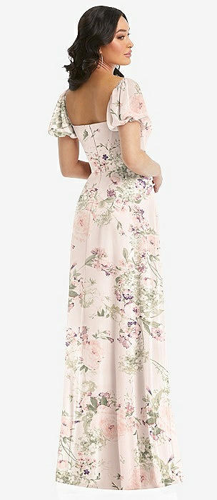 Puff Sleeve Chiffon Maxi Dress with Front Slit in blush garden