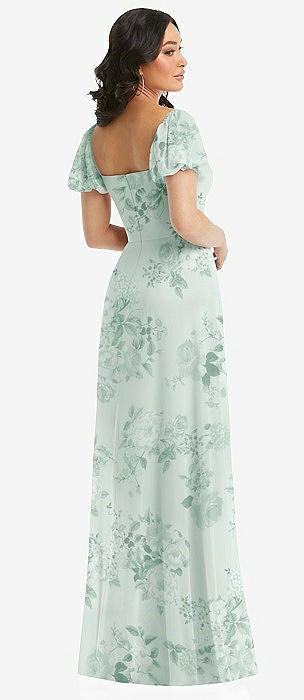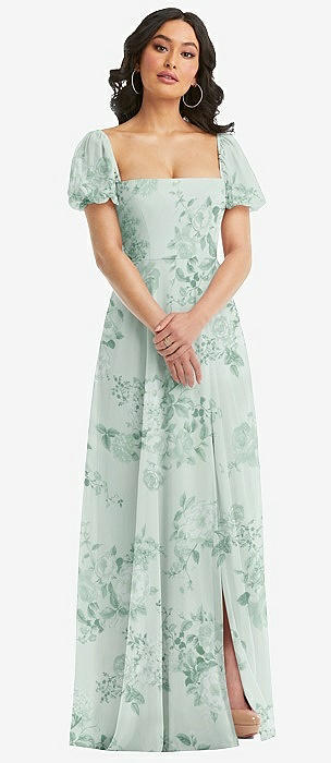 Puff Sleeve Chiffon Maxi Dress with Front Slit in mint green floral