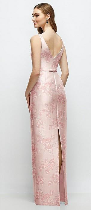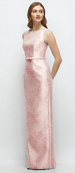 Floral Bateau Neck Satin Column Dress with Bow-Trimmed Skinny Belt in butterfly botanica pink sand