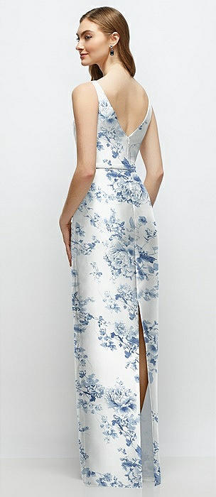 Deep V-back Floral Satin Trumpet Dress with One-Shoulder Cascading Bow in porcelain blue seraphina floral
