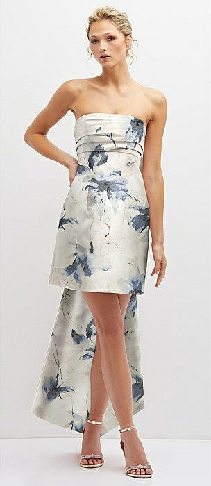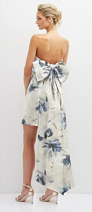 Floral Strapless Satin Column Mini Dress with Oversized Bow in inkwash blue floral