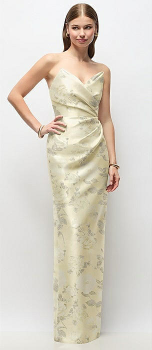 Strapless Asymmetrical Draped Satin Column Floral Maxi Dress in butter yellow floral