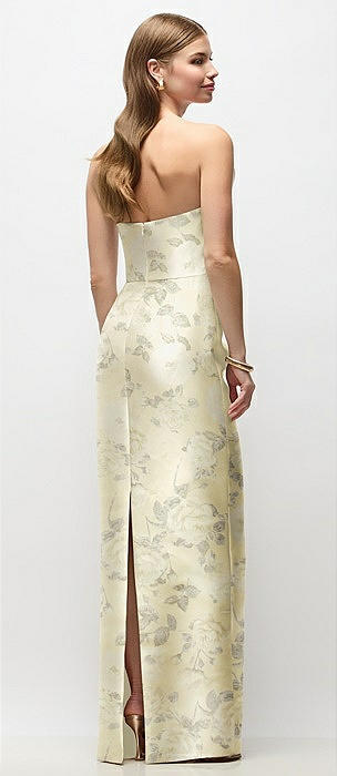 Strapless Cuff Floral Satin Maxi Dress with Column Skirt & Back Bow in butter yellow floral