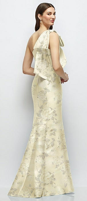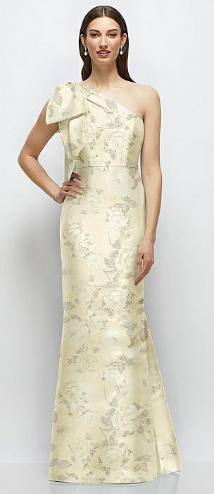Bow One-Shoulder Satin Floral Maxi Dress with Trumpet Skirt in butter yellow floral