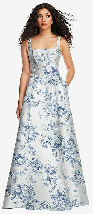 Boned Corset Closed-Back Floral Satin Gown with Full Skirt in porcelain blue seraphina floral