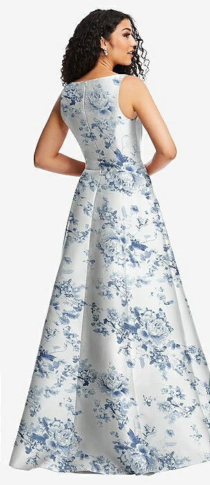 Boned Corset Closed-Back Floral Satin Gown with Full Skirt in bow and blossom print