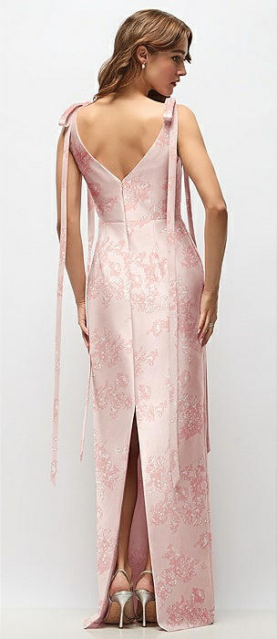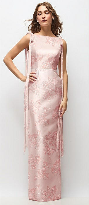 Floral Bateau Neck Satin Column Maxi Dress with Exaggerated Tail Bow Straps in butterfly botanica pink sand