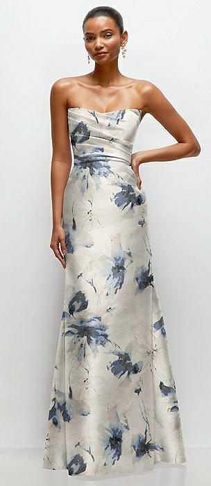 Strapless Cat-Eye Draped Bodice Floral Satin Tumpet Dress in inkwash blue floral