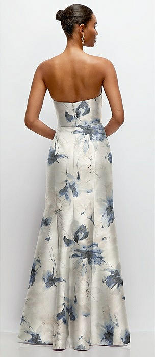 Strapless Floral Satin Column Dress with Removeable Watteau Train in inkwash blue floral