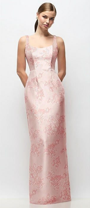 Scoop Neck Floral Satin Column Maxi Dress in bow and blossom print