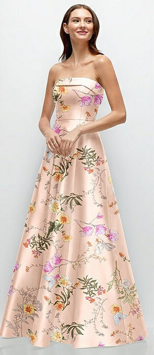 Strapless Floral Satin Gown with Full Skirt and Covered Buttons at Back in butterfly botanica pink sand