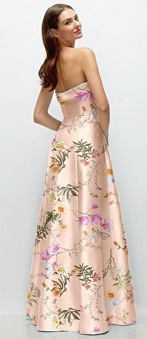 Strapless Bias Cuff Bodice Floral Satin Gown with Pockets in butterfly botanica pink sand