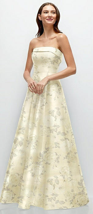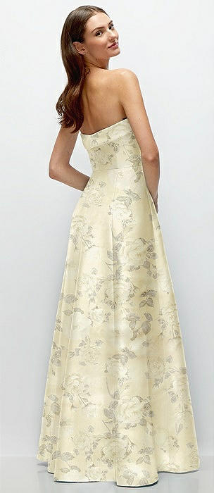 Strapless Floral Satin Gown with Full Skirt and Covered Buttons at Back in butter yellow floral