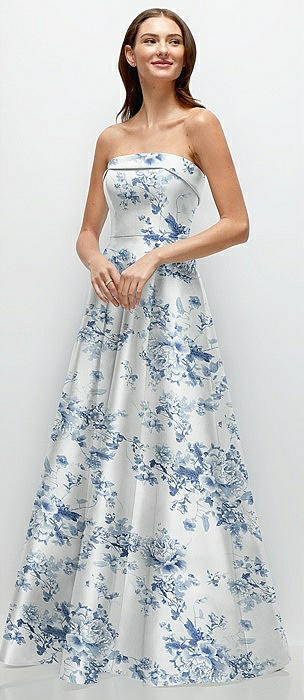 Strapless Floral Satin Gown with Full Skirt and Covered Buttons at Back in porcelain blue seraphina floral