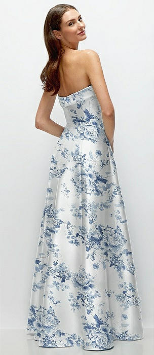 Strapless Bias Cuff Bodice Floral Satin Gown with Pockets in porcelain blue seraphina floral