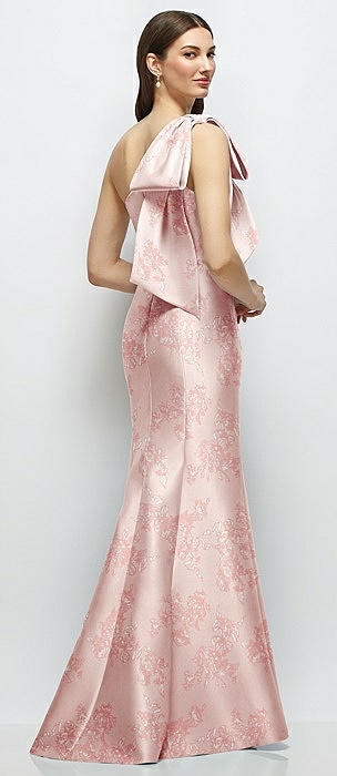 Bow One-Shoulder Satin Floral Maxi Dress with Trumpet Skirt in bow and blossom print