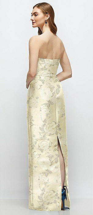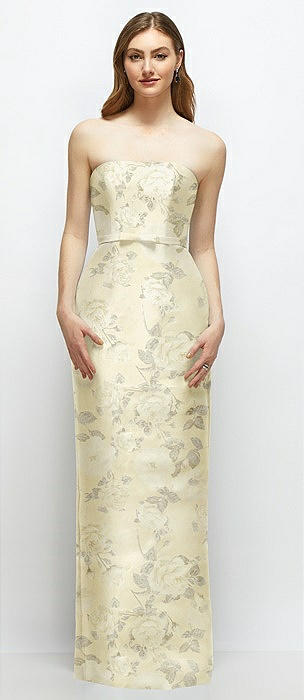 Floral Strapless Satin Column Dress with Bow-Trimmed Skinny Belt in butter yellow floral