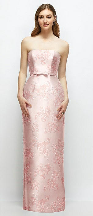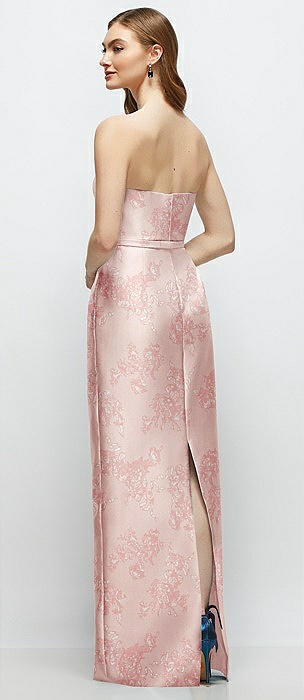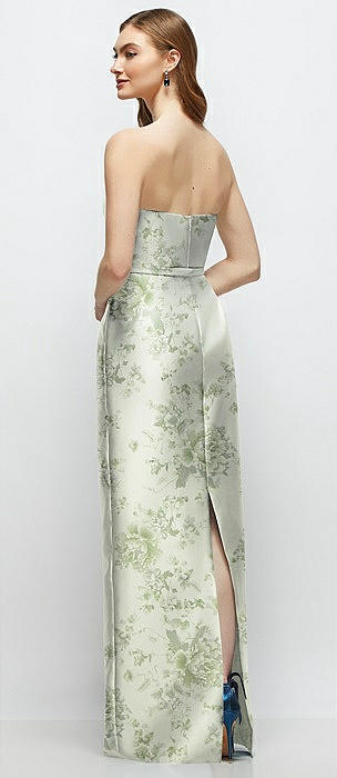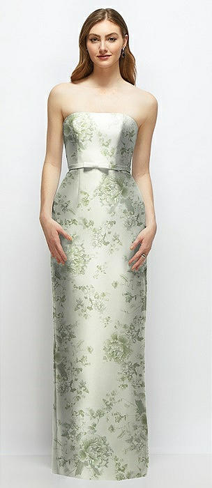 Floral Strapless Satin Column Dress with Bow-Trimmed Skinny Belt in sage cottage rose