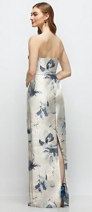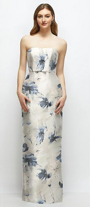 Floral Strapless Satin Column Dress with Bow-Trimmed Skinny Belt in inkwash blue floral