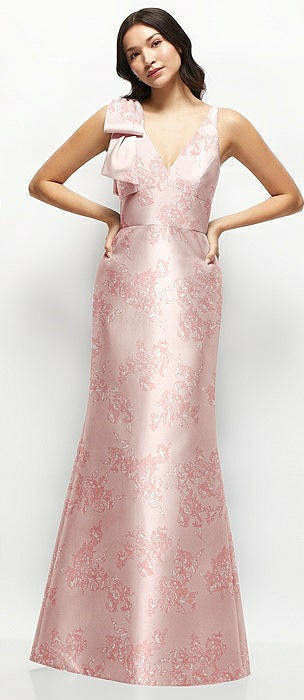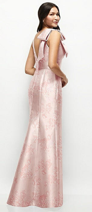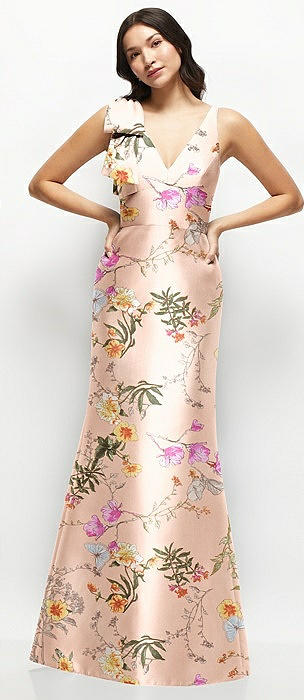 Deep V-back Floral Satin Trumpet Dress with One-Shoulder Cascading Bow in butterfly botanica pink sand