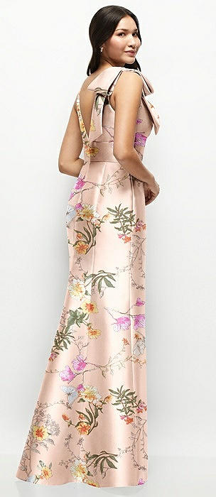 Deep V-back Floral Satin Trumpet Dress with One-Shoulder Cascading Bow in bow and blossom print