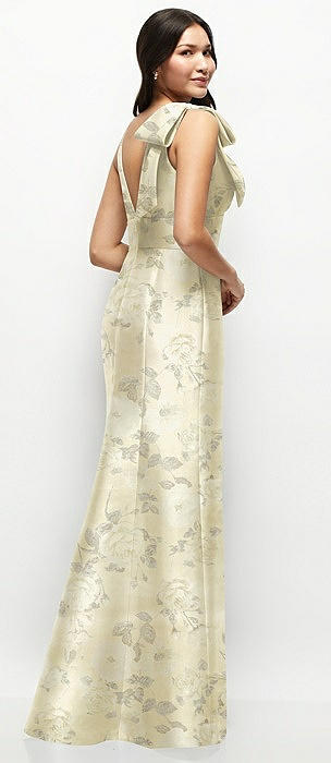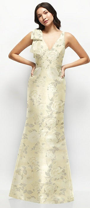 Deep V-back Floral Satin Trumpet Dress with One-Shoulder Cascading Bow in butter yellow floral