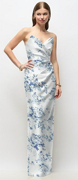 Strapless Cat-Eye Draped Bodice Floral Satin Tumpet Dress in cottage rose larkspur