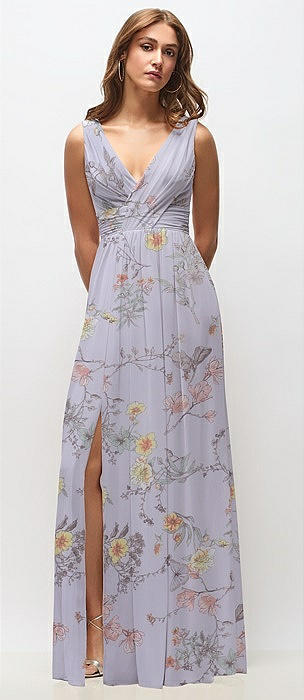 Sleeveless Draped Chiffon Maxi Dress with Front Slit in cottage rose dusk blue
