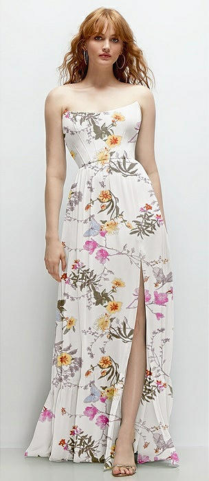 Strapless Cat-Eye Corset Maxi Dress with Ruffle Hem A-Line Skirt in butterfly botanica ivory