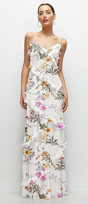 Asymmetrical Ruffle Chiffon Bias Slip Maxi Dress in butterfly botanica ivory