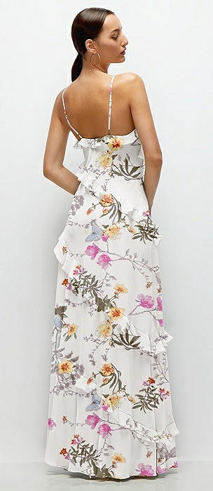 Bustier-Style Chiffon Tiered Ruffle Maxi Dress with Adjustable Straps in butterfly botanica ivory