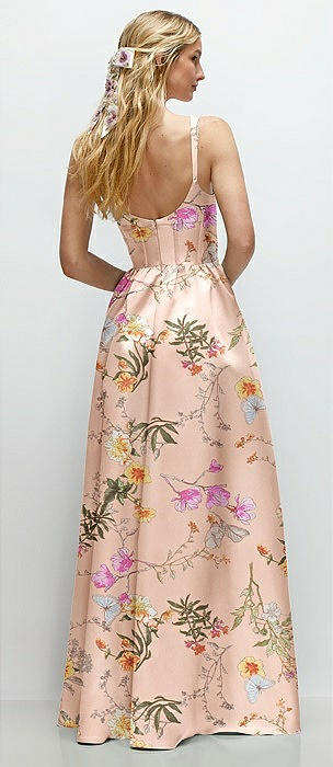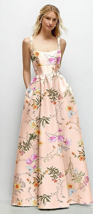 Scoop Neck Inset Corset Floral Satin Maxi Dress with Pockets in butterfly botanica pink sand