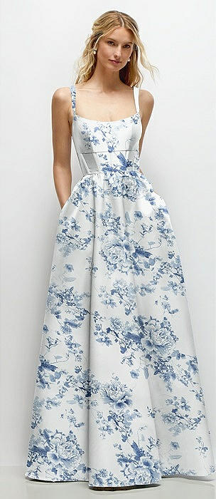 Floral Square-Neck Satin Maxi Dress with Full Skirt in porcelain blue seraphina floral