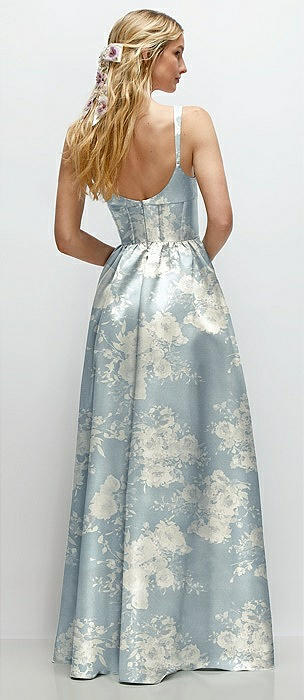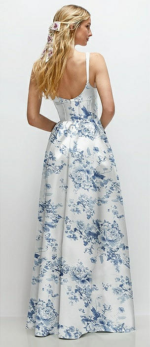 Scoop Neck Inset Corset Floral Satin Maxi Dress with Pockets in porcelain blue seraphina floral