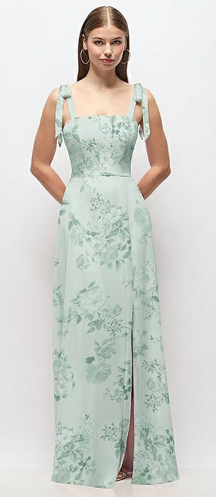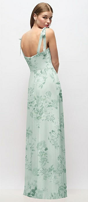 Tie-Shoulder Chiffon Maxi Dress with Front Slit in mint green floral