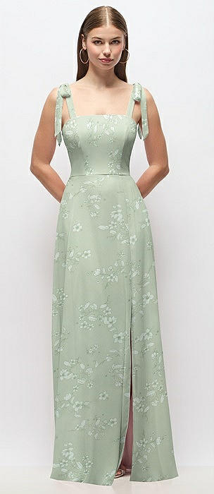 Tie-Shoulder Chiffon Maxi Dress with Front Slit in mint green floral