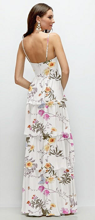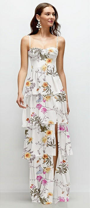 Bustier-Style Chiffon Tiered Ruffle Maxi Dress with Adjustable Straps in butterfly botanica ivory