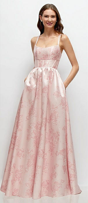 Scoop Neck Inset Corset Floral Satin Maxi Dress with Pockets in butterfly botanica pink sand
