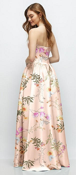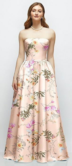 Floral Strapless Satin Drop Waist Gown with Full Skirt in butterfly botanica pink sand