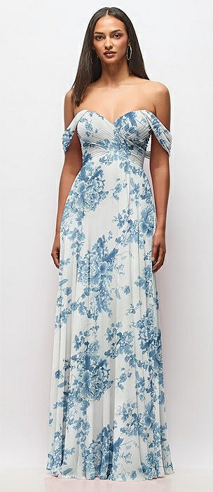 Off-the-Shoulder Draped Chiffon Maxi Dress in mint green floral
