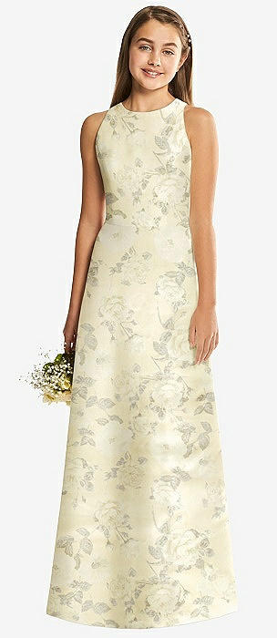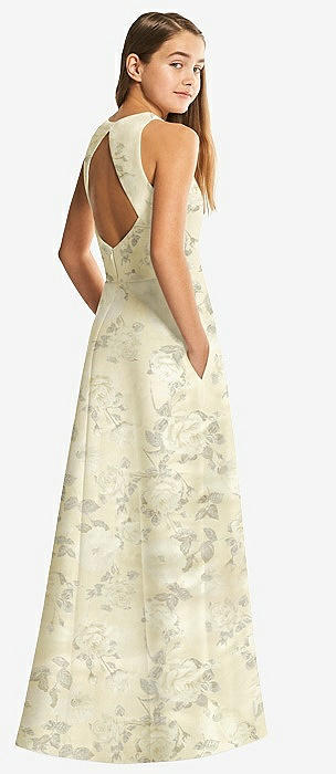 Floral Sleeveless Open-Back Satin Junior Bridesmaid Dress in butter yellow floral