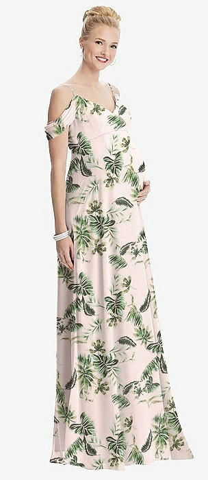 Draped Cold-Shoulder Chiffon Maternity Dress in palm beach print
