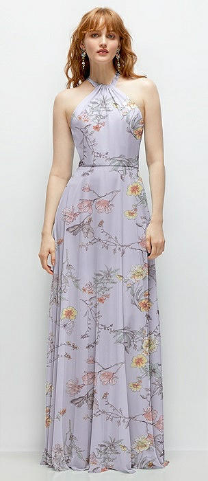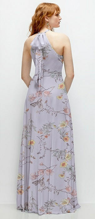 Shirred Halter Chiffon Maxi Dress with Back Sash-Tie Closure in butterfly botanica silver dove