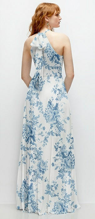 Shirred Halter Chiffon Maxi Dress with Back Sash-Tie Closure in bleu garden