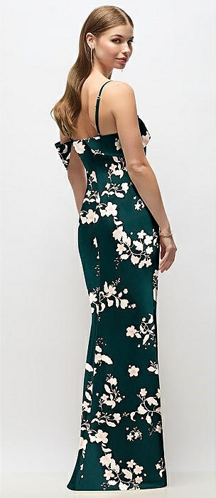 Asymmetrical Cuff Neck Floral Stretch Satin Bias Maxi Dress with Adjustable Spaghetti Straps in vintage primrose evergreen