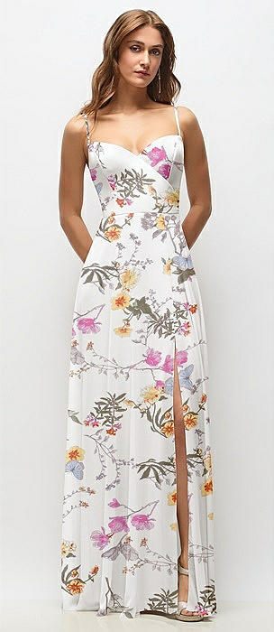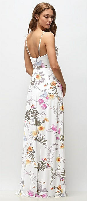 Wrap Bodice Floral Chiffon Maxi Dress with Adjustable Spaghetti Straps in butterfly botanica ivory