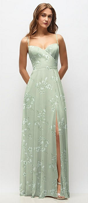 Wrap Bodice Floral Chiffon Maxi Dress with Adjustable Spaghetti Straps in vintage primrose sage