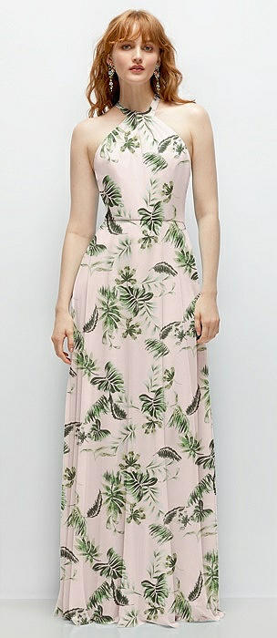 Shirred Halter Chiffon Maxi Dress with Back Sash-Tie Closure in blush garden